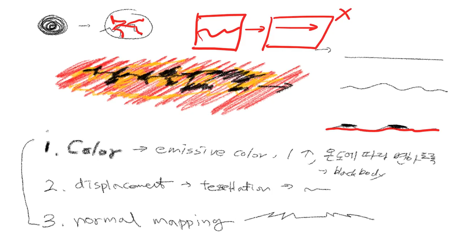 1. 3가지 색 적용 -> emissive color사용(스스로 빛을 내야하기 때문에) / 온도에 따라 변하도록 (black body사용)