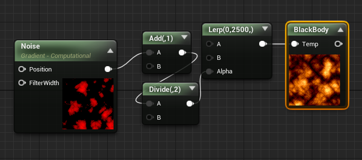 다음으로 온도에 따라 색을 변경해주는 BlackBody를 생성하여 온도의 일정범위(0, 2500)를 선형보간하여 전달해줍시다.