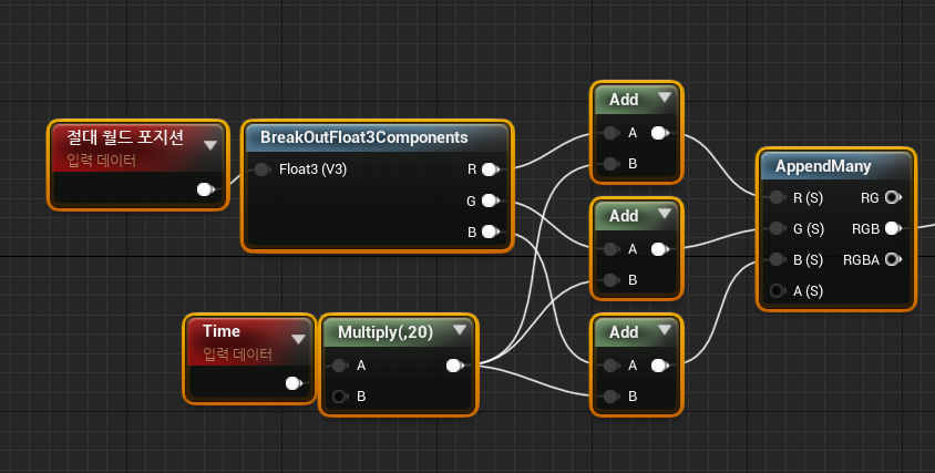 텍스쳐가 고정된것이 아닌 이동시켜봅시다. Noise의 Position파라미터를 전달하기 위해 월드 포지션을 불러와 적절한 값의 Time값을 더해줍니다.