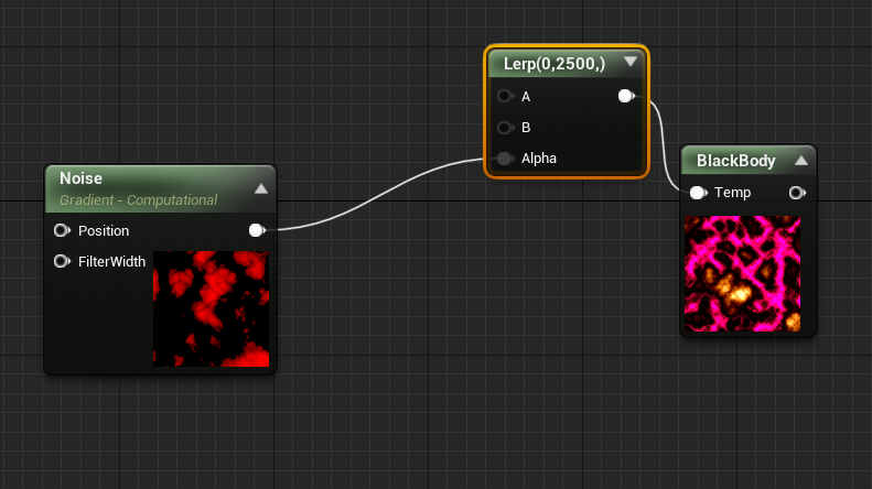 다음으로 온도에 따라 색을 변경해주는 BlackBody를 생성하여 온도의 일정범위(0, 2500)를 선형보간하여 전달해줍시다.