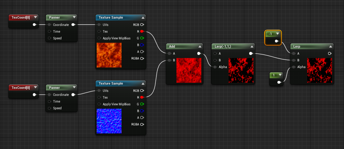 현재 양수부분만 출력되고 있어 검은색 부분이 너무 적습니다. lerp를 사용하여 -1 ~ 1까지의 범위를 지정해 음수값도 출력하도록 합시다.