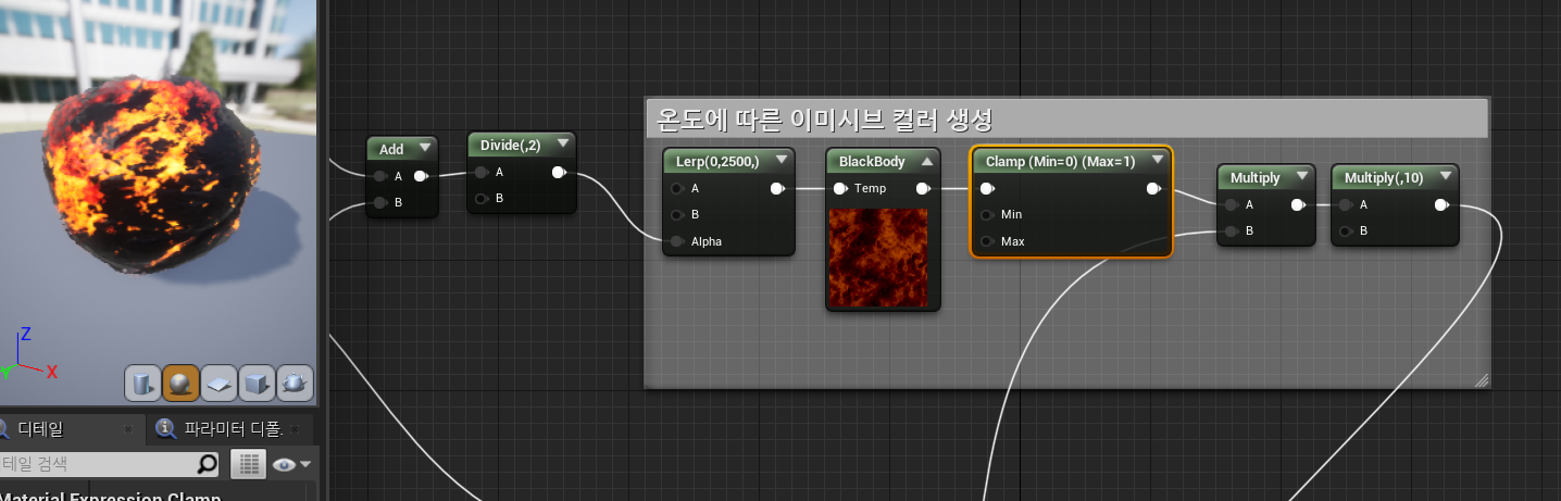 하지만 검은색이 아니라 파란색부분이 나타나고 있네요. Blackbody에 음수값이 출력되고 있어 Clamp로 0~1값만 출력하도록하여 CrustNoise패턴과 곱해줍시다.