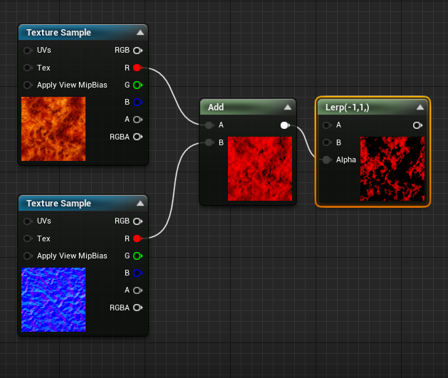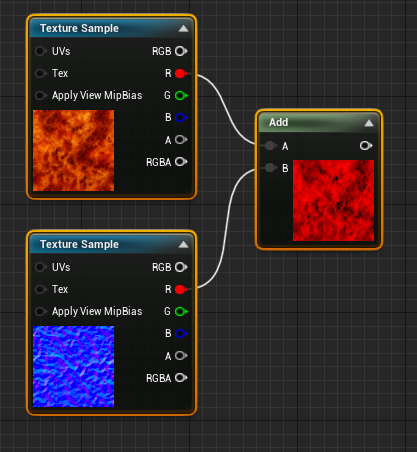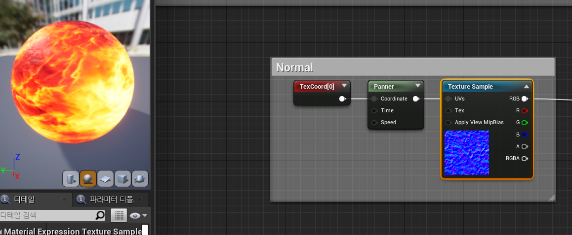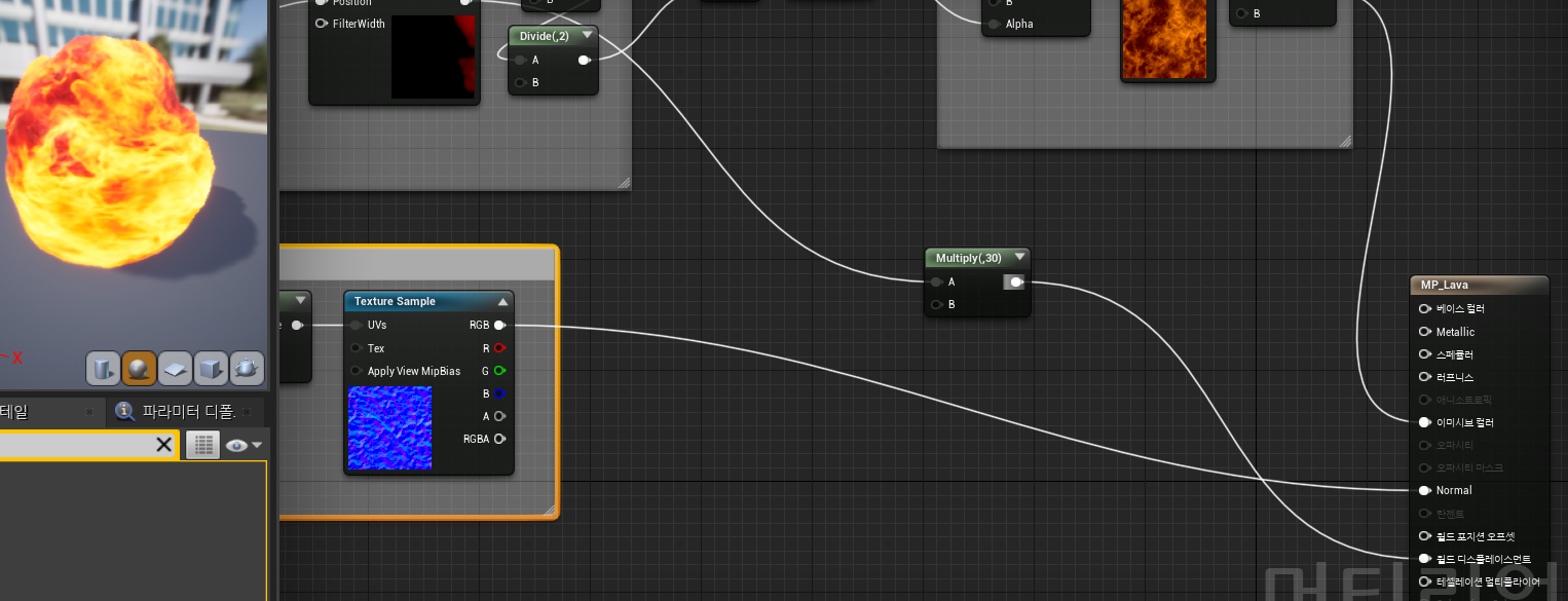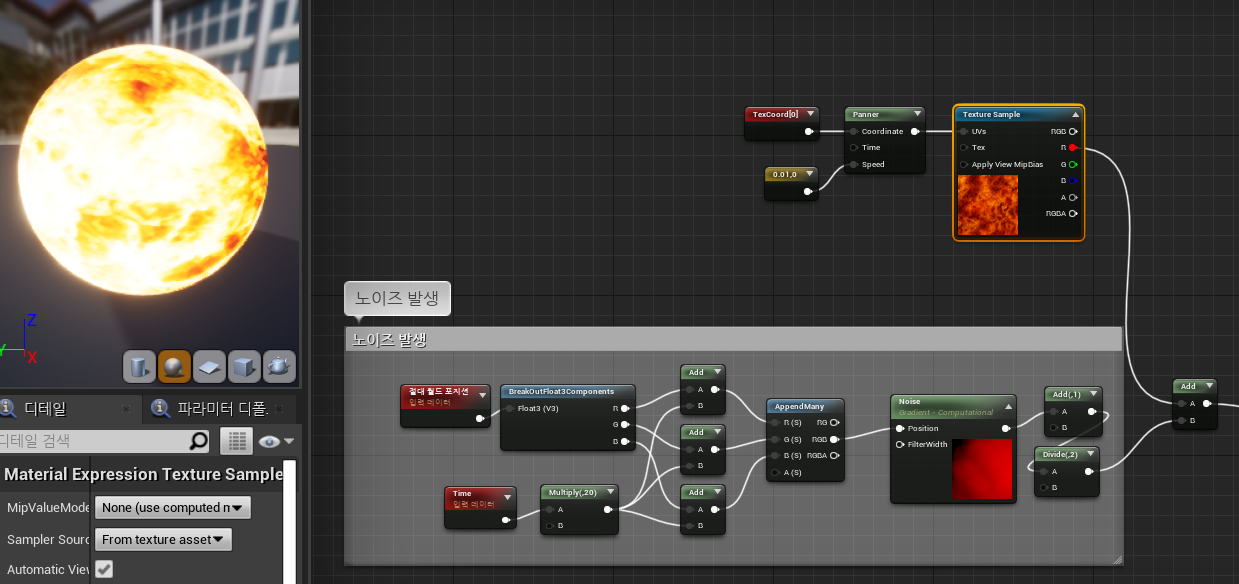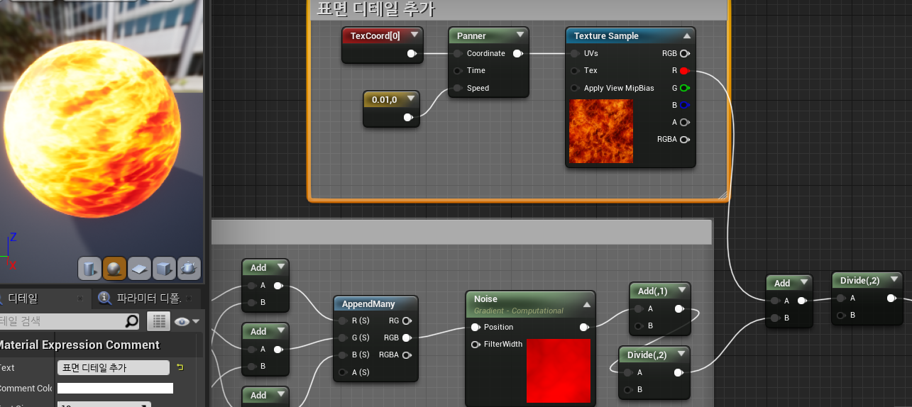 다음 용암에서 식어 조각나있는 검은부분을 만들어 볼겁니다. 우선 노말값을 추가할때 사용했던 텍스쳐와, 표면디테일을 표현할때 사용한 fire 텍스쳐의 r채널을 더합니다.