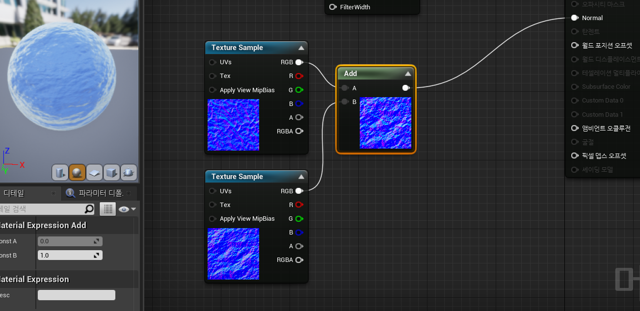 rock 노말 텍스쳐를 적용해줍시다. 만약 여러개의 노말패턴을 만들고 싶다면 add로 더해준후 연결해주면 됩니다.