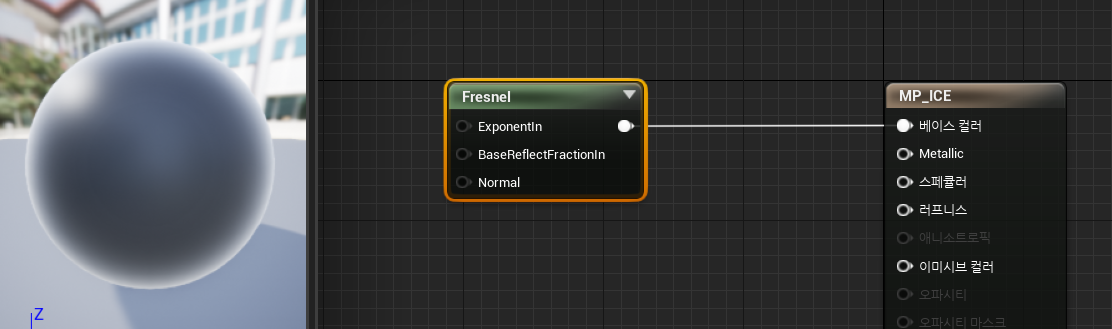 하지만 겉이 어둡고 안이 밝도록 출력되어버렸습니다. oneMinus를 사용하여 Fresnel의 역수값을 연결해줍시다.