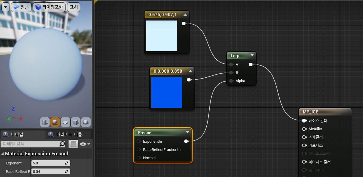 안쪽으로 갈수록 점점 어두운 색이 나오도록 표현하기 위해 Fresnel 기능을 사용합시다.