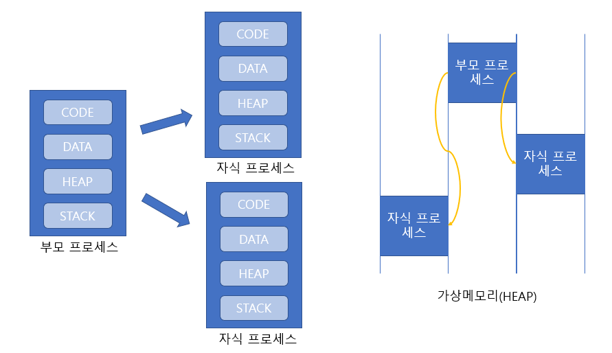 - 주소공간 메모리 구조는 프로세스마다 개별적이다. (부모 프로세스의 주소를 자식프로세스에서 사용할시 에러가 남 -> 힙영역이 다르기 때문에)