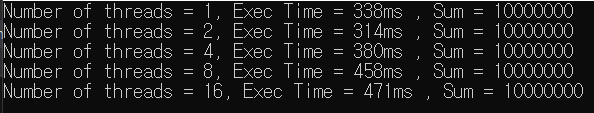 정확한 결과는 나오지만, 성능이 오히려 싱글코어보다 떨어진다.