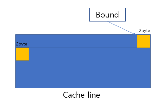 bound에는 값이 잘들어가 있는데 v에는 이상한 값이 들어가 있다. bound가 가리키는 데이터가 두개의 캐시메모리에 걸쳐져서 그렇다. 캐시라인을 전송하는것은 atomic하게 전송된다. 하지만 캐시라인 2개는 두번의 걸쳐서 계산되었다.(ffff / ffff0000)
