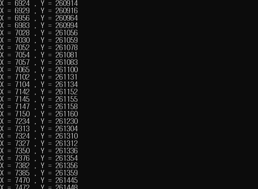 std::cout << "X = " << trace_x[i] << " , Y = " << i << std::endl;