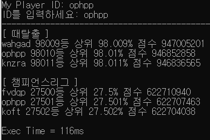 - 내 순위 기준으로 내 위와 아래 순위 플레이어의 id와 점수를 표시한다.
