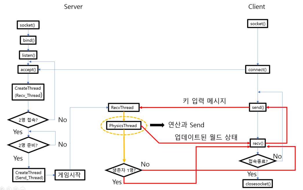 - 로비에서 2개의 클라이언트의 준비상태를 확인한다. 모두 준비상태이면 PhysicsThread를 만들고, 초기화된 월드 상태를 보낸다.
