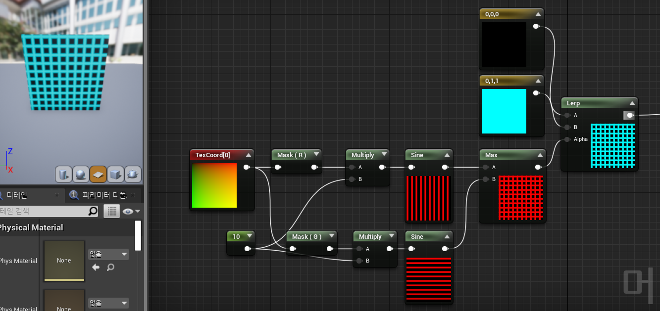 max를 이용하여 두 줄무늬를 합쳐주고, 만든 패턴을 알파값에 적용한후 선형보간하여(lerp) 울타리 패턴의 텍스쳐 틀을 제작합니다.